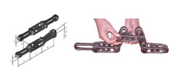 ZHXT系列分英制X348、X458、X678,公制XT80、XT100、XT160重型模锻链。重型悬挂输送机整体是由驱动装置、张紧装置、回转装置、牵引链条、滑架、轨道等组成。链条在悬挂输送机中,链条是传递动力的构件,牵引链选择是否得当直接影响输送机的使用寿命及性能。链条由内链片、外链片和销轴组成,不用工具就能方便地进行装配、分解。各部件由特殊钢经精密锻造制成,热处理后具有高强度、耐热、耐摩擦、耐腐蚀、耐冲击等优点。链条整体弯曲性能好,能进行小角垂直度倾斜及大角度水平转弯输送,输送时噪音小。销轴走行时不转动,耐磨性好,而且更换方便。